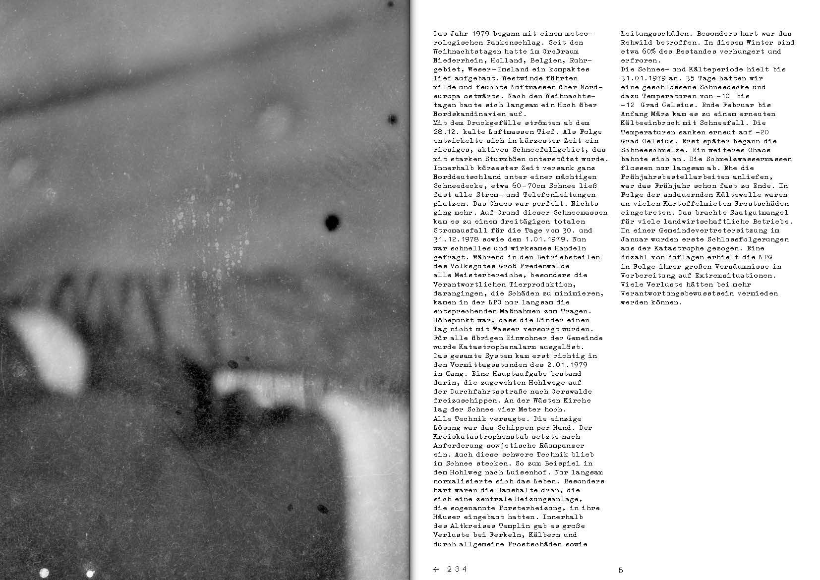 Gefunden wurden die fotografierten Steine, laut einer Bestandsaufnahme in Heide 2 und einem Texttafel an der Wand, in der Datsche des LPG-Wohnblocks. Eine ganze Reihe weiterer Gegenstände ist hier aufgelistet: Schallplatten und Kassetten, Hefte und Einmachgläser, die Ausstattung eines Fotolabors. Es sind Überreste eines vergangenen Alltags, Hinterlassenschaften einer Person, deren Charakterisierung sich allmählich anhand der von ihr gesammelten Dinge herausbildet. Der Blick auf das Leben in dem kleinen DDR-Ort wird anhand der Text- und Bildfragmente aus der Chronik der Gemeinde Groß-Fredenwalde sowie anhand des Gesprächsprotokolls zwischen der Künstlerin Lackner und einem Mann namens Wolfgang zunehmend schärfer gestellt.