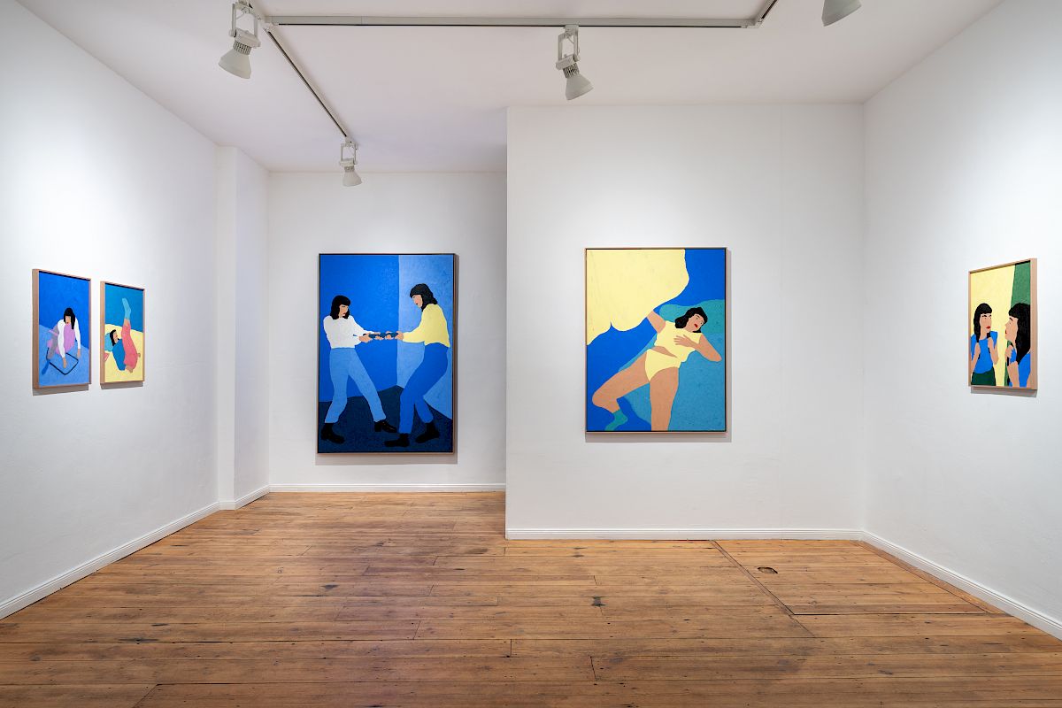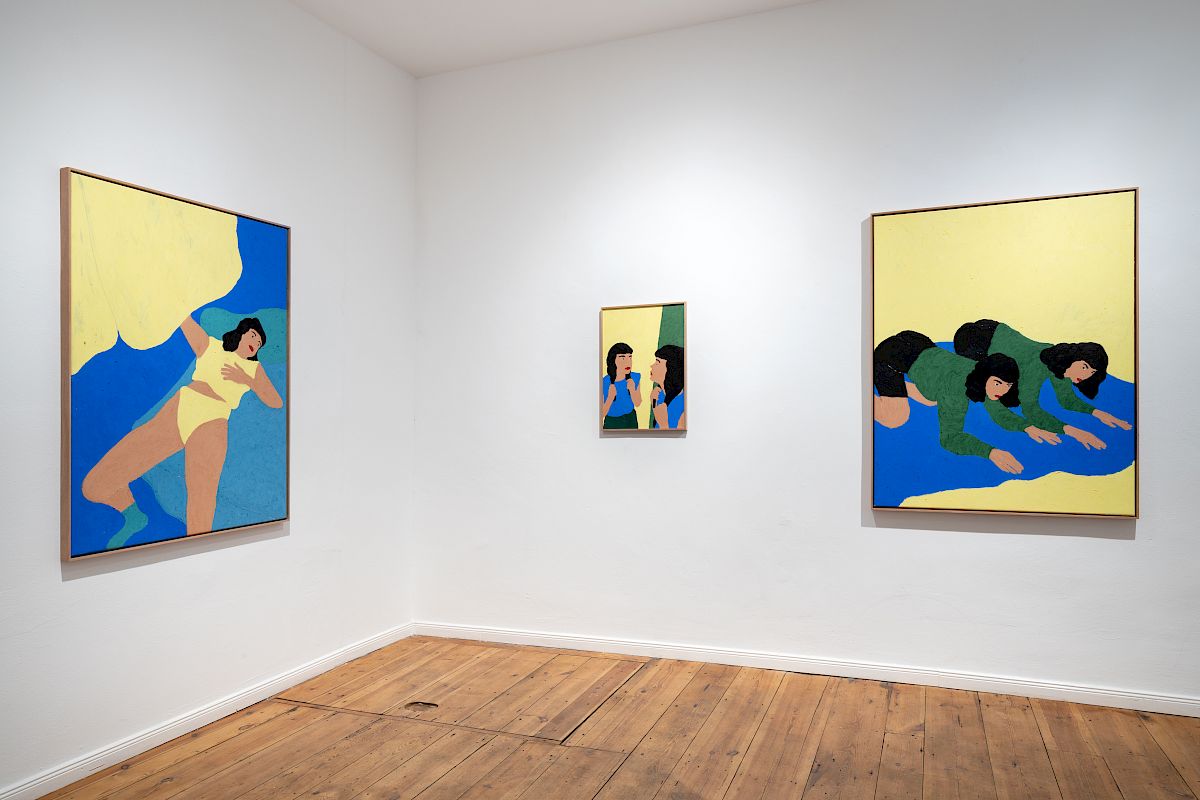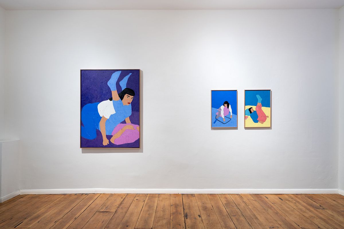 In ihrer Soloausstellung Zähneputzen ist nicht schwer in der Weserhalle präsentiert Larissa Rosa Lackner die neusten Arbeiten der seit 2021 fortlaufenden Serie Ok bin da. Die Künstlerin zeigt alltäglich Szenen die ständig auf der Kippe zwischen Spannung und Entspannung der zentralen Figur mit sich selbst, ihren Aktionen und ihrer Umgebung, zu stehen scheinen. Der Titel der Ausstellung spiegelt das Dilemma von den Figuren in Lackner's Arbeiten wider. Eine Sache wie Zähneputzen die alltäglich ist oder sein sollte...ist sie deswegen automatisch einfach? Ist es okay wenn es nicht einfach ist? Mit wem macht man das aus? In ihren Arbeiten wird man mal als willkommener Gast, mal als ein vermeintlicher Eindringling teil diese Bewältigung des Alltags mit zu spüren. Die Künstlerin schafft Empathie für die Momente in denen man mit sich selbst alleine gelassen fühlt und Sehnüchte, Zwänge und Loslassen individuell zum Vorschein kommen. Es is ein Relikt aus der Corona-Pandemie in der die Künstlerin die Serie auf Grund der notwendigen Isolation begonnen hat. Lackner lässt ihre Erfahrung als Fotografin in die Werke einfließen indem sie die zentrale Figur, seriell behandelt. Es entsteht das Gefühl einer Narration um die Figur. Je nachdem mit welcher Aktion der Protagonistin man als Betrachter*in beginnt, setzt sich die finale Geschichte neu zusammen. Die Perspektive, das in Szene setzen der Figur wir ein Modell und die Snapshot-Ästhetik sind ebenfalls Attribute der Fotografie die Lackner eindrucksvoll verwendet, um eine ungefilterte Nähe zur Figur zu etablieren. Diese Nähe wird aber im selben Moment gebrochen. Der Blick auf den weiblichen Körper wie ein Produkt, das man sowohl aus der westlichen Kunstgeschichte kennt, wie auch dem voyeuristischen Blick in sozialen Medien verwehrt der betrachtenden Person tatsächliche Nähe und Intimität.